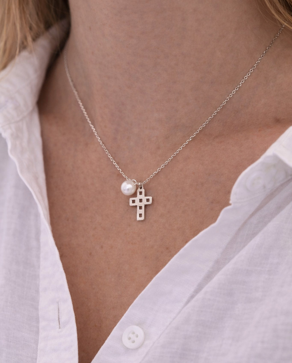 Κομψό κολιέ σταυρός από Λευκό Χρυσό 14 καρατίων και μαργαριτάρι.