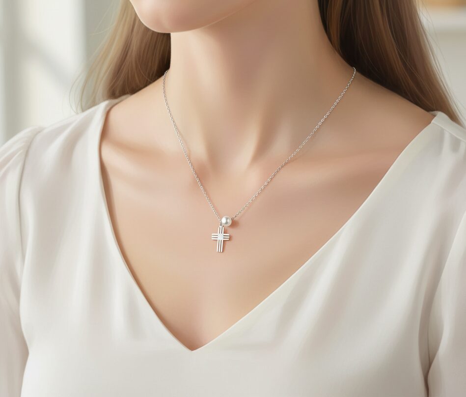 Διακριτικό κολιέ ‘σταυρός’ από Λευκό Χρυσό 14 καρατίων με μαργαριτάρι.